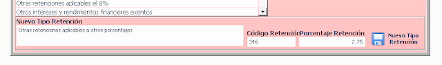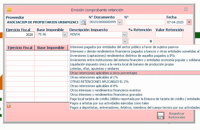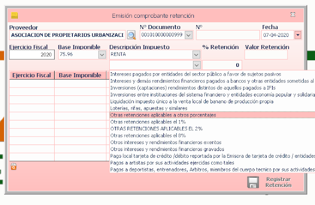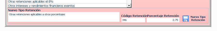 Utilizamos la sección en el fondo de la ventana de configuración de retenciones renta del producto, y escribimos en las casillas correspondientes los datos: